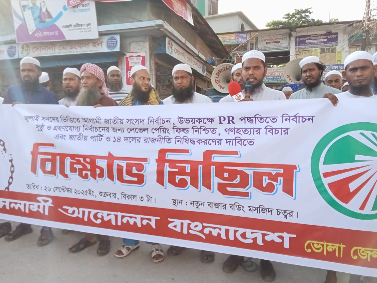 জুলাই সনদের ভিত্তিতে আগামী জাতীয় সংসদ নির্বাচন, উভয়কক্ষে পিআর পদ্ধতিতে নির্বাচন সুষ্ঠু ও গ্রহণযোগ্য নির্বাচনের জন্য লেভেল পেয়িং ফিল্ড নিশ্চিত, গণহত্যার বিচার এবং জাতীয় পার্টি ও ১৪ দলের রাজনীতি নিষিদ্ধকরণের দাবিতে শুক্রবার বিকালে নতুন বাজার বডিং মসজিদ চত্বরে ইসলামী আন্দোলন বাংলাদেশ ভোলা জেলার উদ্যোগে বিক্ষোভ মিছিল অনুষ্ঠিত হয়।