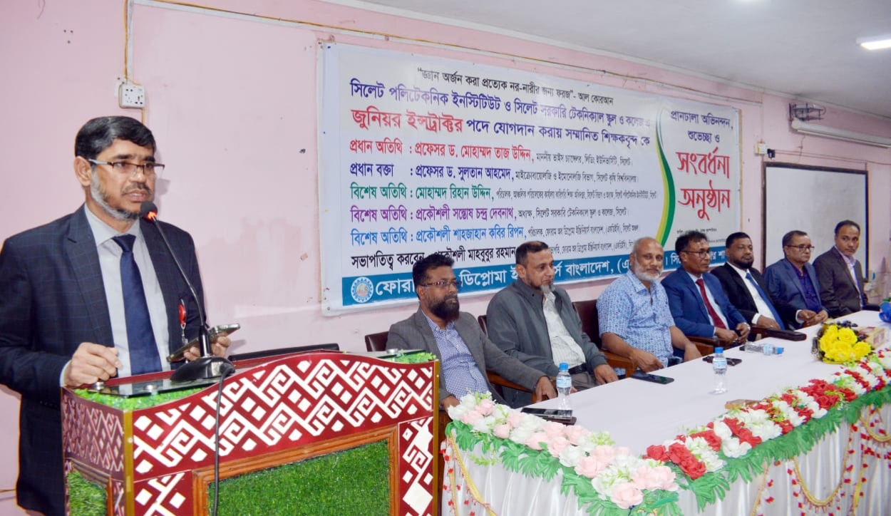 বৃহস্পতিবার (২৭ নভেম্বর) সন্ধ্যা সাড়ে ৫টায় সিলেট পলিটেকনিক ইনস্টিটিউটের করফারেন্স হলে ফোরাম অব ডিপ্লোমা ইঞ্জিনিয়ার্স বাংলাদেশ (এফডিইবি) সিলেট মহানগর শাখার উদ্যোগে সিলেট পলিটেকনিক ইনস্টিটিউট ও সিলেট সরকারি টেকনিক্যাল স্কুল ও কলেজে জুনিয়র ইন্সট্রাক্টর পদে যোগদান করায় আয়োজিত সংবর্ধনা অনুষ্ঠানে প্রধান অতিথির বক্তব্যে তিনি উপরোক্ত কথাগুলো বলেন।