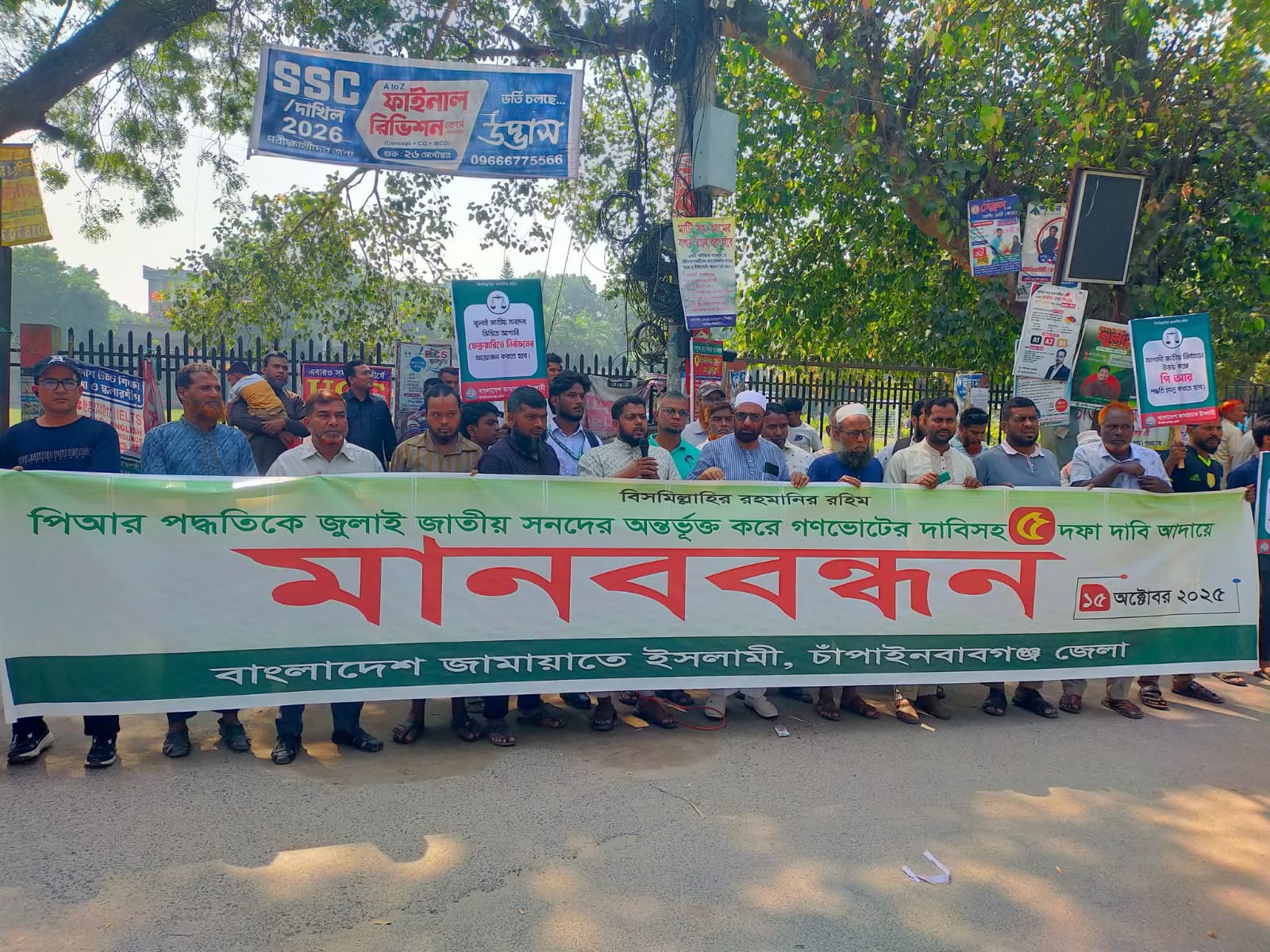 পিআর পদ্ধতিকে জুলাই জাতীয় সনদের অন্তর্ভুক্ত করে গণভোটের দাবিসহ ৫ দফা দাবি বাস্তবায়নের লক্ষ্যে চাঁপাইনবাবগঞ্জে মানববন্ধন অনুষ্ঠিত হয়েছে। বুধবার সকালে জেলা প্রশাসকের কার্যালয়ের সামনে বাংলাদেশ জামায়াতে ইসলামী চাঁপাইনবাবগঞ্জ জেলা শাখার উদ্যোগে এ কর্মসূচির আয়োজন করা হয়।