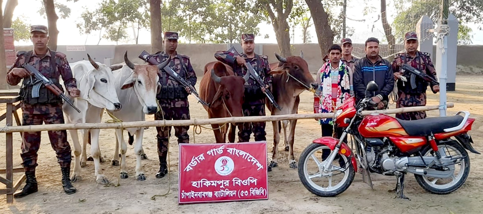 চাঁপাইনবাবগঞ্জ ব্যাটালিয়ন ৫৩ বিজিবি বিশেষ তথ্যের ভিত্তিতে আজ ০৬ ডিসেম্বর হাকিমপুর বিওপির একটি বিশেষ টহলদল চাঁপাইনবাবগঞ্জ জেলার সদর থানাধীন শাহাজাহানপুর ইউনিয়নের হাকিমপুর গ্রামে অভিযান পরিচালনা করে। বিজিবি আনুমানিক রাত ৪ টায় অভিযান চালিয়ে শিবগঞ্জ উপজেলার রঘুনাথপুর গ্রামের মোঃ তৈমুর রহমানের ছেলে মোঃ রজদুল (৩০) ও চাঁপাইনবাবগঞ্জ সদর উপজেলা চরবাগডাঙ্গা ইউনিয়নের বড়গোটাপাড়া গ্রামের মৃত আলাউদ্দীনের ছেলে মোঃ শাকিল (৩২) সহ ০৪টি ভারতীয় গরু, ০১টি মোটরসাইকেল ও ০২টি মোবাইলসহ আটক করতে সক্ষম হন। এছাড়াও ঘটনাস্থল থেকে একটি ব্যবহৃত মোটরসাইকেল উদ্ধার করা হয়। আটককৃত আসামীদের বিরুদ্ধে যথাযথ আইনানুগ ব্যবস্থা গ্রহণের নিমিত্তে জব্দকৃত গরু, মোটরসাইকেল ও মোবাইল চাঁপাইনবাবগঞ্জ সদর থানায় হস্তান্তর করার কার্যক্রম প্রক্রিয়াধীন। যার আনুমানিক সিজার মূল্য ০৭ (সাত) লক্ষ টাকা।
