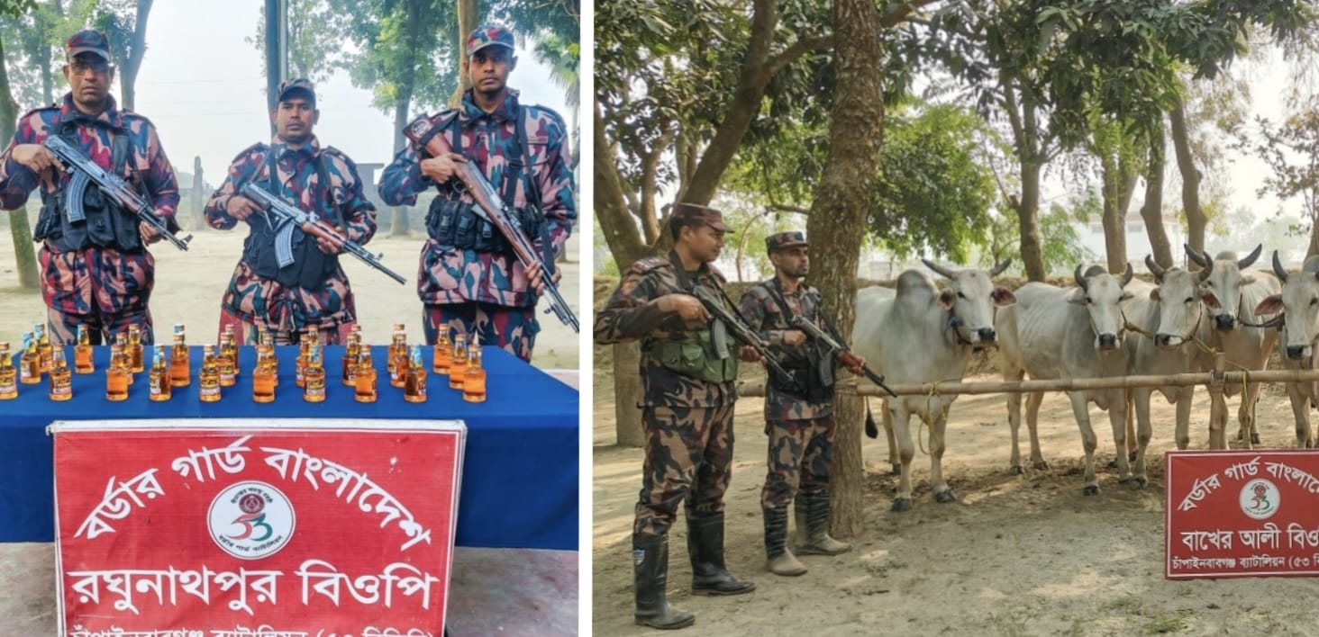 চাঁপাইনবাবগঞ্জ ব্যাটালিয়ন (৫৩ বিজিবি) গোপন তথ্যের ভিত্তিতে গতকাল ০২ জানুয়ারি সকাল ৫ ঘটিকা হতে প্রায় ৪ ঘন্টা পর্যন্ত ৫৩ বিজিবি এর বিশেষ টহলদল পৃথক পৃথক ০৫টি অভিযান পরিচালনা করে ভারতীয় ৬৬ বোতল মদ ও ১১টি গরু জব্দ করে। অভিযানসমূহে ৫৩ বিজিবির অধীনস্থ ফতেপুর বিওপি হতে টহল দল শিবগঞ্জ থানাধীন পাকা ইউনিয়নের শ্যামপুর গ্রাম থেকে ভারতীয় ৩৭ বোতল মদ ও রঘুনাথপুর বিওপি হতে শিবগঞ্জ থানাধীন দুর্লভপুর ইউনিয়নের কুকরিচর গ্রাম থেকে ২৯ বোতল মদ এবং মাসুদপুর বিওপি হতে শিবগঞ্জ থানাধীন মনাকষা ইউনিয়নের চৌধুরী স্মরণী গ্রাম থেকে ০৩টি গরু, মনাকষা বিওপি হতে শিবগঞ্জ থানাধীন মনাকষা ইউনিয়নের সেতারাপাড়া গ্রাম থেকে ০১টি গরু ও বাখেরআলী বিওপি হতে টহল দল’টি চাঁপাইনবাবগঞ্জ সদর থানাধীন নারায়নপুর ইউনিয়নের সোনাদিয়ারচর গ্রাম থেকে ০৭টি গরু জব্দ করে। জব্দকৃত ভারতীয় মদ ও গরুর আনুমানিক বাজার মূল্য ২৩ লক্ষ টাকা। জব্দকৃত মদ শিবগঞ্জ থানায় এবং গরু চাঁপাইনবাবগঞ্জ শুল্ক কার্যালয়ে জমা করা হয়েছে।
