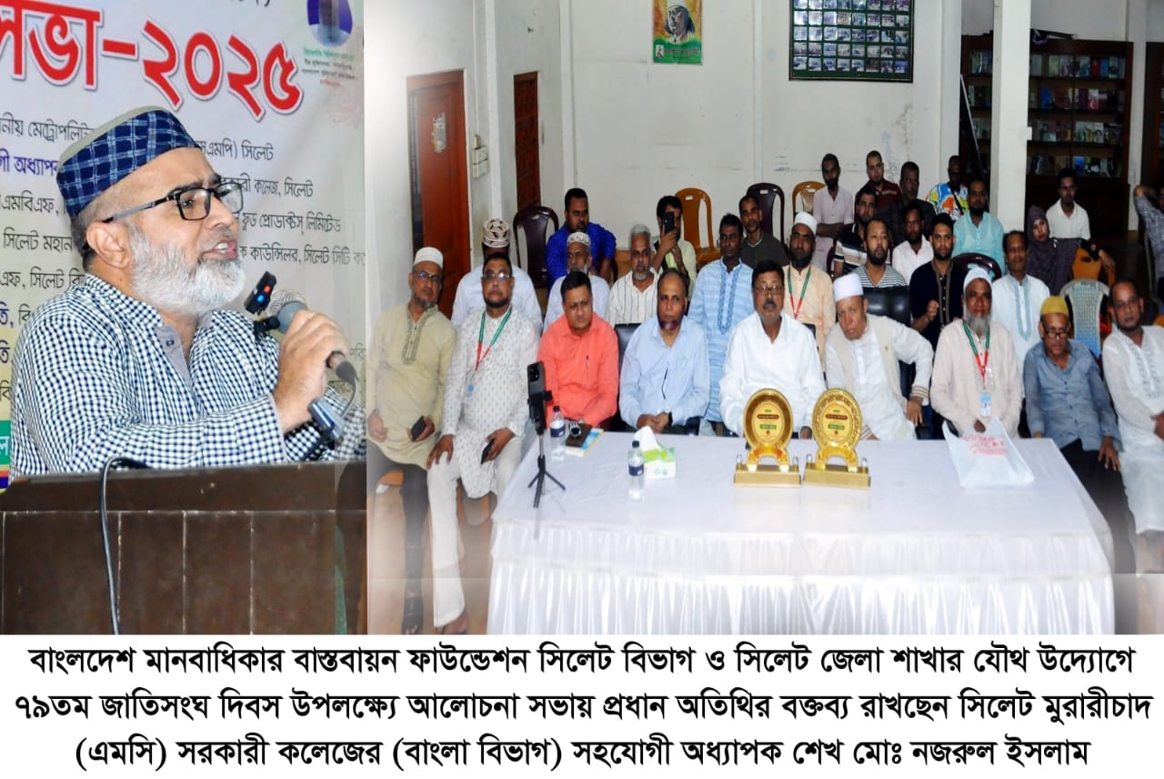 শুক্রবার (২৪ অক্টোবর) বিকেল ৪টায় নগরীর জিন্দাবাজারস্থ নজরুল একাডেমি হলরুমে বাংলদেশ মানবাধিকার বাস্তবায়ন ফাউন্ডেশন সিলেট বিভাগ ও সিলেট জেলা শাখার যৌথ উদ্যোগে ৭৯তম জাতিসংঘ দিবস উপলক্ষ্যে আলোচনা সভায় প্রধান অতিথির বক্তব্যে তিনি উপরোক্ত কথাগুলো বলেন।