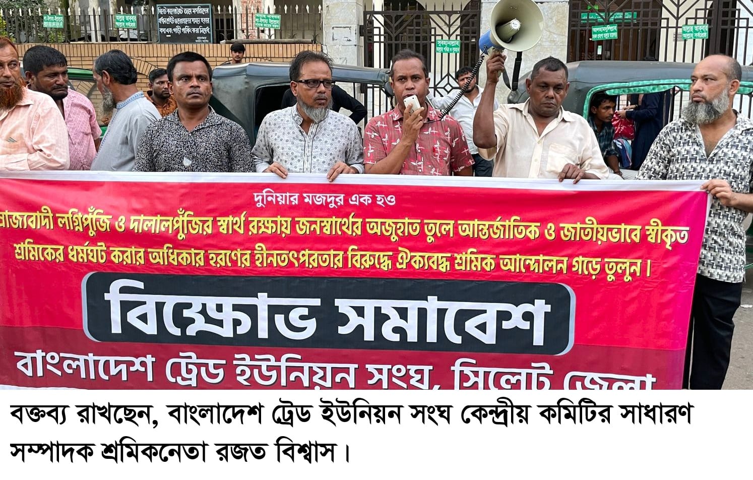চট্টগ্রাম বন্দর এলাকায় সভা-সমাবেশ নিষিদ্ধ ঘোষণা ও অগ্নিদগ্ধ হয়ে ১৬জন শ্রমিকদের মৃৃত্যুর প্রতিবাদ জানিয়ে এবং অবিলম্বে জাতীয় নিম্নতম মজুরি বোর্ড গঠন করে আইনী সুরক্ষা দিয়ে জাতীয় নিম্নতম মূল মজুরি ৩০ হাজার টাকা ঘোষণা, আইএলও কনভেনশন ৮৭ ও ৯৮ অনুযায়ী অবাধ ট্রেড অধিকার ও কর্মক্ষেত্রের নিরাপত্তাসহ ১০ দফা দাবিতে বাংলাদেশ ট্রেড ইউনিয়ন সংঘের কেন্দ্রীয় কর্মসূচীর অংশ হিসেবে সিলেটেও পালিত। ১৭ অক্টোবর বিকেল ৪টায় সুরমা পয়েন্টে জমায়েত হয়ে বিক্ষোভ মিছিল শহরের বিভিন্ন গুরুত্বপূর্ণ সড়ক প্রদক্ষিণ করে কোর্ট পয়েন্টে গিয়ে সংগঠনের ভারপ্রাপ্ত সভাপতি আবুল কালাম আজাদ সরকারের সভাপতিত্বে এবং সাধারণ সম্পাদক মো. ছাদেক মিয়ার পরিচালনায় সংক্ষিপ্ত সমাবেশ অনুষ্ঠিত হয়। এ সময় বক্তব্য রাখেন বাংলাদেশ ট্রেড ইউনিয়ন সংঘ কেন্দ্রীয় কমিটির সাধারণ সম্পাদক শ্রমিকনেতা রজত বিশ্বাস, জাতীয় গণতান্ত্রিক ফ্রন্ট সিলেট জেলা কমিটির দপ্তর সম্পাদক রমজান আলী পটু, জাতীয় ছাত্রদল সিলেট জেলা আহবায়ক শুভ আজাদ শান্ত, সিলেট জেলা হোটেল শ্রমিক ইউনিয়নের সাবেক সাংগঠনিক সম্পাদক ইমান আলী, ক্রীড়া ও সাংস্কৃতিক সম্পাদক সুনু মিয়া (সাগর), সিলেট সদর উপজেলা স’মিল শ্রমিক সংঘের সভাপতি হজর আলীসহ প্রমুখ। নেতৃবৃন্দ ক্ষোভ প্রকাশ করে বলেন শ্রমিকদের জন্য নিরাপদ কর্মপরিবেশ নিশ্চিত করতে না পারলেও মার্কিন সা¤্রাজ্যবাদের দালাল বর্তমান অন্তবর্তীকালীন সরকার চট্টগ্রাম বন্দর নিরাপদে বিদেশীদের নিকট ইজারা প্রদানের অংশ হিসেবে বন্দর এলাকায় সকল ধরনের সভা-সমাবেশ নিষিদ্ধ করেছে। শুধু তাই নয় এই সরকার প্রভু সা¤্রাজ্যবাদকে খুশি করতে তারই পরিকল্পনার অংশ হিসেবে মানবিক করিডোর প্রদান, জাতিসংঘের মানবাধিকার কমিশনের অফিস স্থাপন, চট্টগ্রাম বন্দরের নিউমোরিং কনটেইনার টার্মিনাল মার্কিন স্বার্থরক্ষাকারী ডিপি ওর্য়াল্ডকে ইজারা প্রদান, স্টারলিংকের স্যাটেলাইট ইন্টারনেট চালু, মার্কিন সেনা উপস্থিতি, ধারাবাহিক মার্কিন সেনাবাহিনীর মহড়া ও প্রশিক্ষণ তৎপরতা, মার্কিনের পক্ষে যুদ্ধে সম্পক্ত করা, আইপিস প্লাসে যুক্ত করা ইত্যাদি বাস্তবায়নের লক্ষ্যে অগ্রসর হচ্ছে।