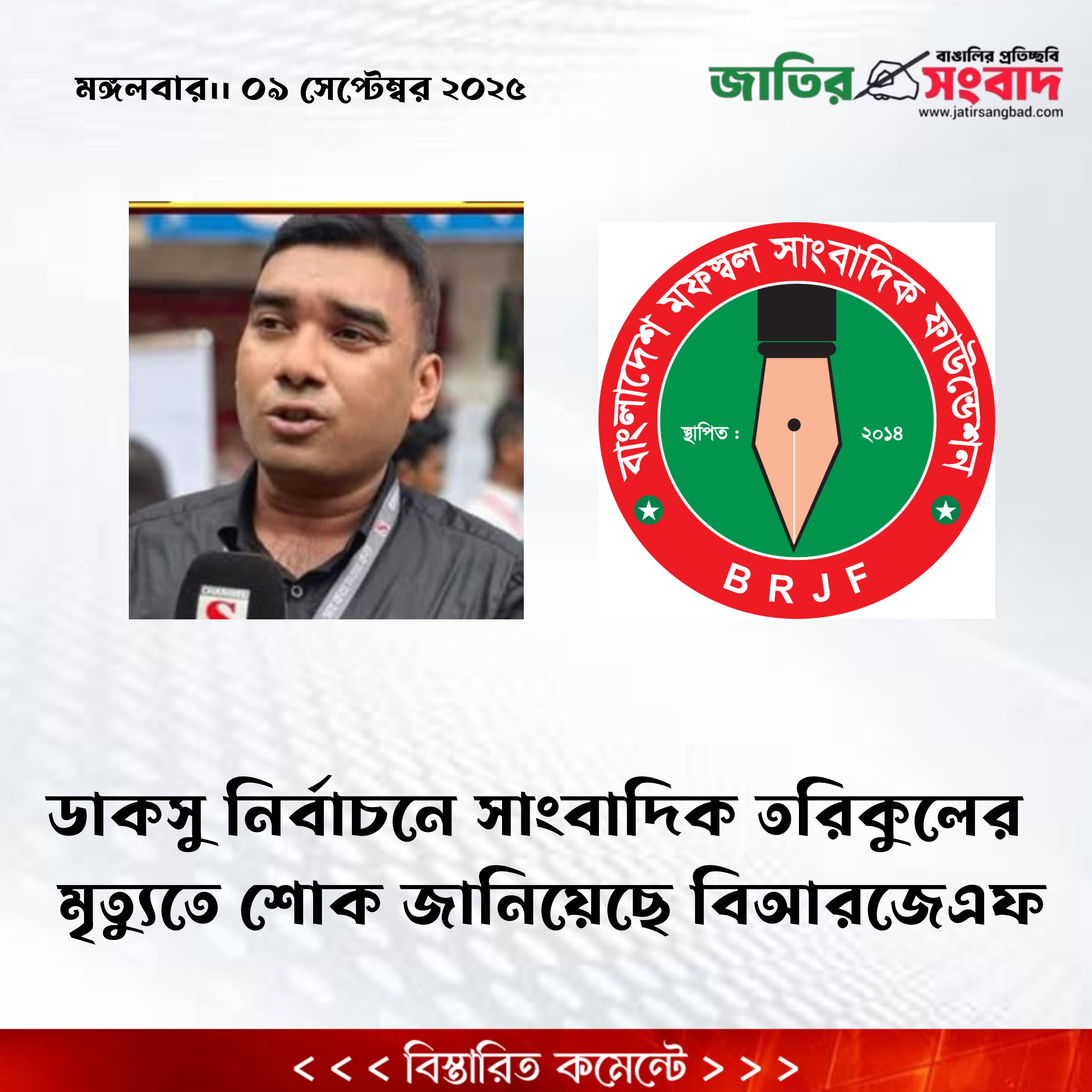 মঙ্গলবার (৯ সেপ্টেম্বর) বিআরজেএফ’র যুগ্ম সম্পাদক রাসেল আহমেদ স্বাক্ষরিত সভাপতি কামাল উদ্দিন আহমেদ ও সাধারণ সম্পাদক গিয়াসউদ্দিন রাকিব এক যৌথ বিবৃতি শোক বার্তা দিয়েছেন।