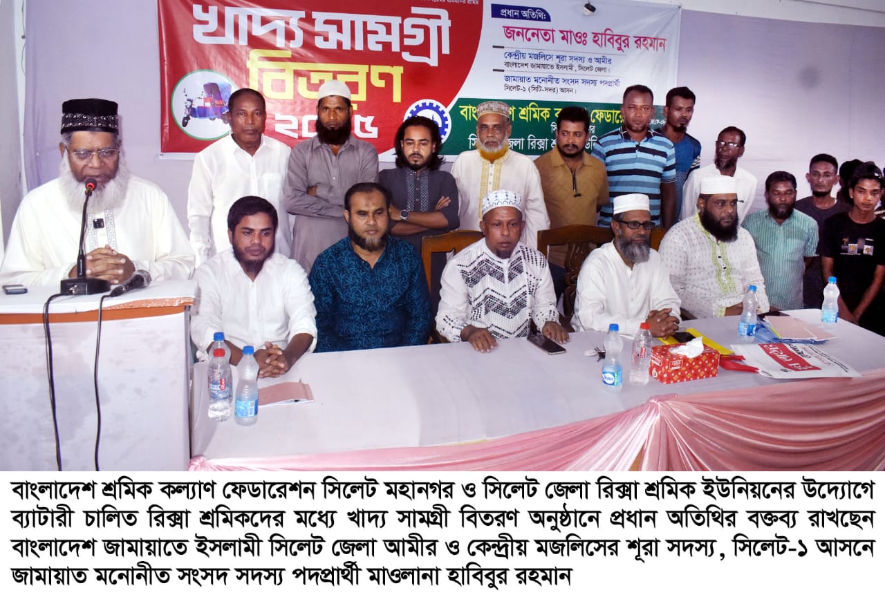 তিনি গতকাল ১৮ অক্টোবর শনিবার বিকালে নগরীর মিরাবাজারস্থ শাহজালাল জামেয়ার হলরুমে বাংলাদেশ শ্রমিক কল্যাণ ফেডারেশন সিলেট মহানগর ও সিলেট জেলা রিক্সা শ্রমিক ইউনিয়ন রেজি. নং চট্ট-১৬৬৯ এর উদ্যোগে ব্যাটারী চালিত রিক্সা শ্রমিকদের মধ্যে খাদ্য সামগ্রী বিতরণ অনুষ্ঠানে প্রধান অতিথির বক্তব্যে উপরোক্ত কথাগুলো বলেন।