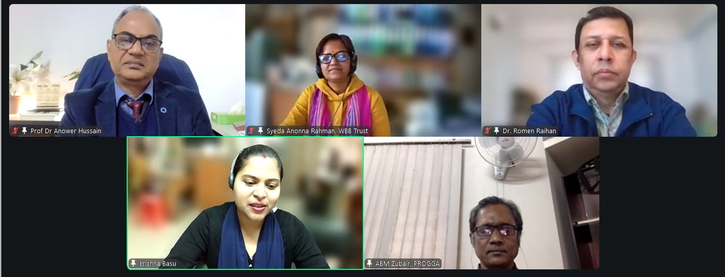অনুষ্ঠানটিতে আলোচক হিসেবে উপস্থিত ছিলেন- জনস্বাস্থ্য বিভাগ, স্টেট ইউনিভার্সিটি অব বাংলাদেশ এর জনস্বাস্থ্য বিভাগের চেয়ারম্যান অধ্যাপক ড. মো. আনোয়ার হোসেন, বাংলাদেশ মেডিক্যাল বিশ্ববিদ্যালয় এর পাবলিক হেলথ এন্ড ইনফরমেটিকস বিভাগের সহযোগী অধ্যাপক ডা. রোমেন রায়হান, প্রজ্ঞা (প্রগতির জন্য জ্ঞান) এর নির্বাহী পরিচালক এ বি এম জুবায়ের, ওয়ার্ক ফর এ বেটার বাংলাদেশ (ডাব্লিউবিবি) ট্রাস্ট এর বিভাগীয় প্রধান (স্বাস্থ্য অধিকার বিভাগ) সৈয়দা অনন্যা রহমান এবং সঞ্চালনায় ছিলেন ডাব্লিউবিবি ট্রাস্টের সহকারি প্রকল্প কর্মকর্তা কৃষ্ণা বসু।