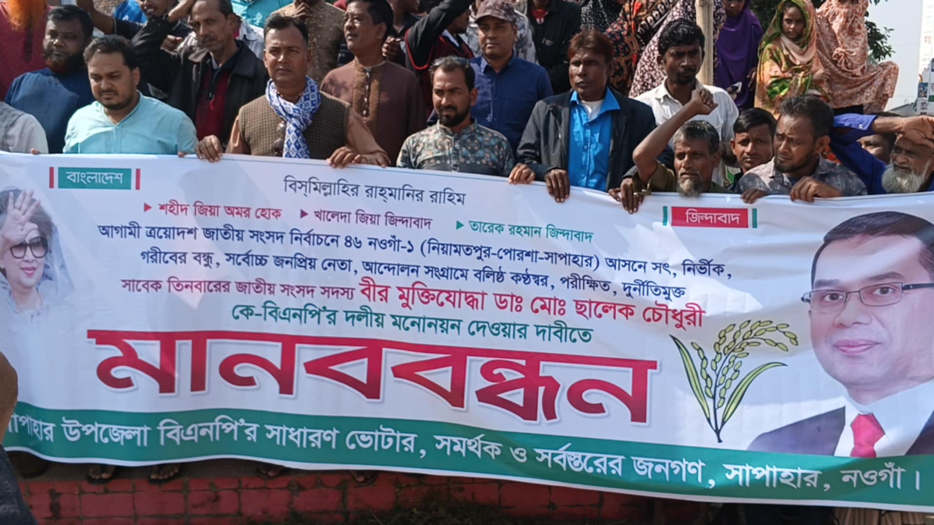 নওগাঁ-১ (সাপাহার–পোরশা–নিয়ামতপুর) আসনে বিএনপির প্রাথমিকভাবে ঘোষিত সংসদ সদস্য প্রার্থী মোস্তাফিজুর রহমানের মনোনয়ন পুনর্বিবেচনার দাবিতে মানববন্ধন ও বিক্ষোভ সমাবেশ অনুষ্ঠিত হয়েছে।
