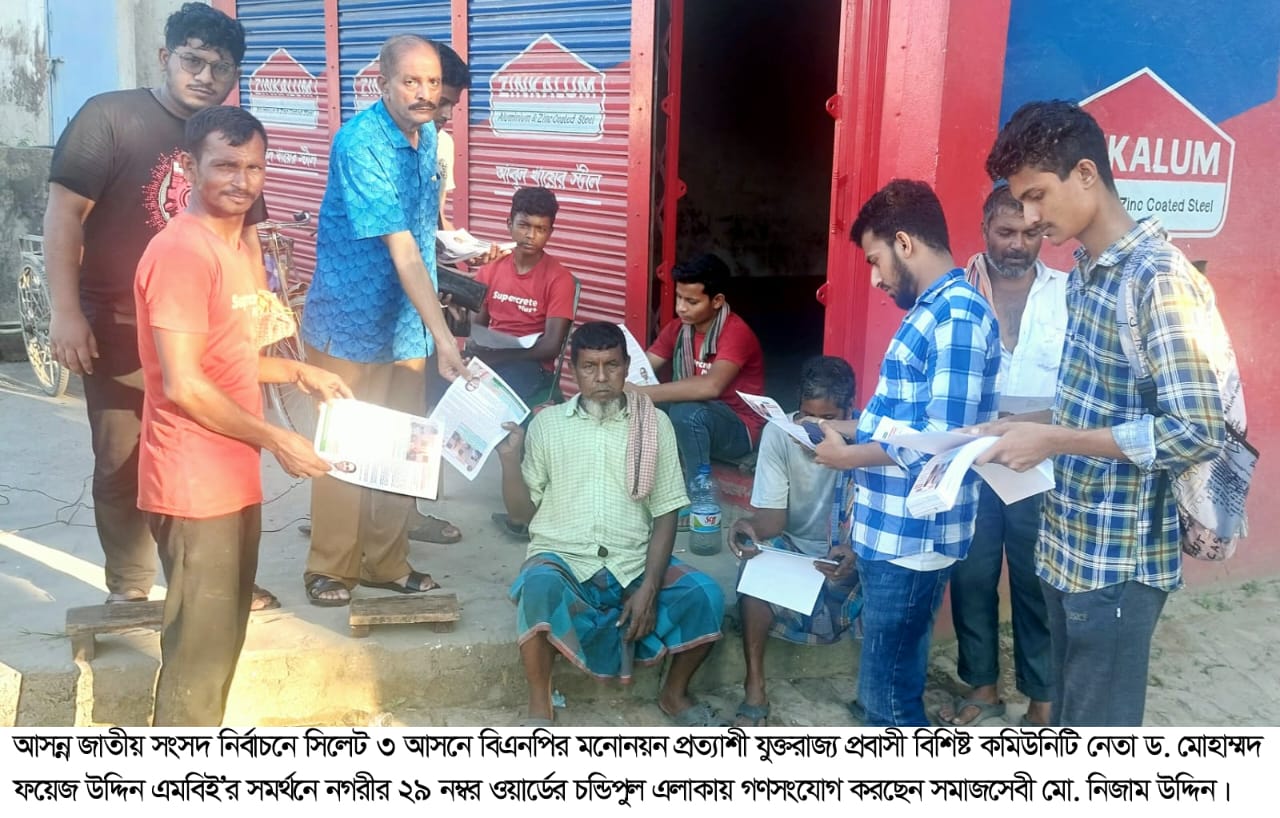 আসন্ন জাতীয় সংসদ নির্বাচনে সিলেট ৩ আসনে বাংলাদেশ জাতীয়তাবাদী দল (বিএনপি)’র মনোনয়ন প্রত্যাশী যুক্তরাজ্য প্রবাসী বিশিষ্ট কমিউনিটি নেতা ড. মোহাম্মদ ফয়েজ উদ্দিন এমবিই’র সমর্থনে নগরীর ২৯ নম্বর ওয়ার্ডের বিভিন্ন এলাকায় গণসংযোগ ও লিফলেট বিতরণ করা হয়েছে।