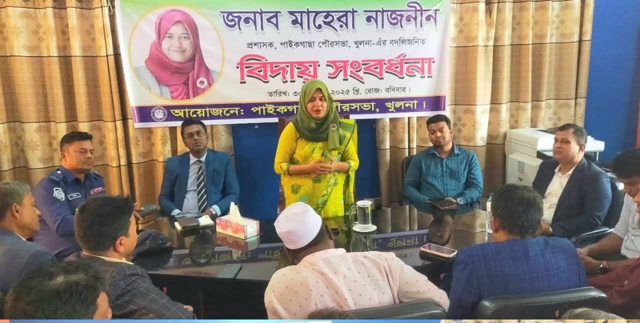 পাইকগাছা পৌরসভার প্রশাসক ও উপজেলা নির্বাহী অফিসার (ইউএনও) মাহেরা নাজনীনকে বিদায়ী শুভেচ্ছা জানিয়েছে পৌরসভার কর্মকর্তা-কর্মচারী বৃন্দ। দায়িত্ব পালনকালে তাঁর নিষ্ঠা, কর্মদক্ষতা ও মানবিক নেতৃত্বে পৌরসভার সার্বিক উন্নয়ন কার্যক্রম এগিয়ে যায় বলে বিদায়ী অনুষ্ঠানে বক্তারা উল্লেখ করেন।