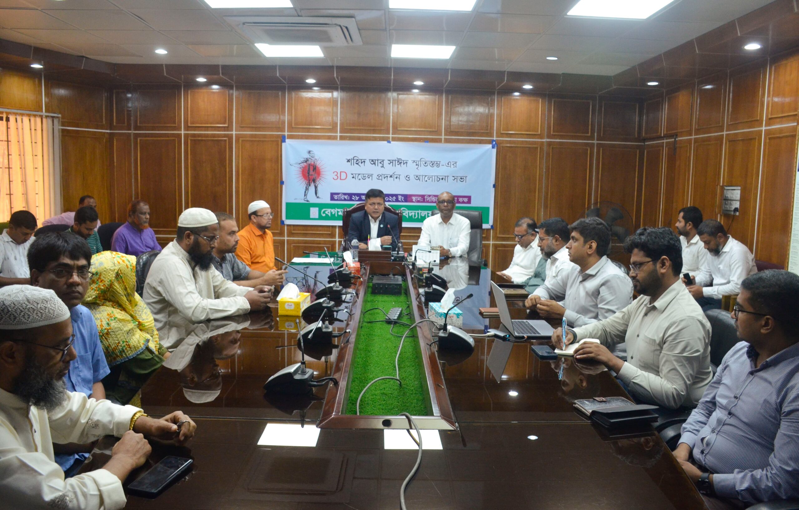 বেগম রোকেয়া বিশ্ববিদ্যালয়, রংপুর এর পার্কের মোড়ে অবস্থিত শহিদ আবু সাঈদ চত্বরে মুক্তিযুদ্ধ বিষয়ক মন্ত্রণালয়ের সহযোগিতায় শহিদ আবু সাঈদ স্মৃতিস্তম্ভ নির্মাণের লক্ষ্যে 3D মডেল প্রদর্শন ও আলোচনা সভা অনুষ্ঠিত হয়েছে। আজ মঙ্গলবার (২৮ অক্টোবর, ২০২৫) সকালে বিশ্ববিদ্যালয়ের প্রশাসনিক ভবনের সিন্ডিকেট সভাকক্ষে বিশ্ববিদ্যালয়ের উপাচার্য প্রফেসর ড. মোঃ শওকাত আলীর সভাপতিত্বে আলোচনা সভায় উপস্থিত ছিলেন মুক্তিযুদ্ধ বিষয়ক মন্ত্রণালয়ের অতিরিক্ত সচিব জিয়াউদ্দিন আহমেদ।