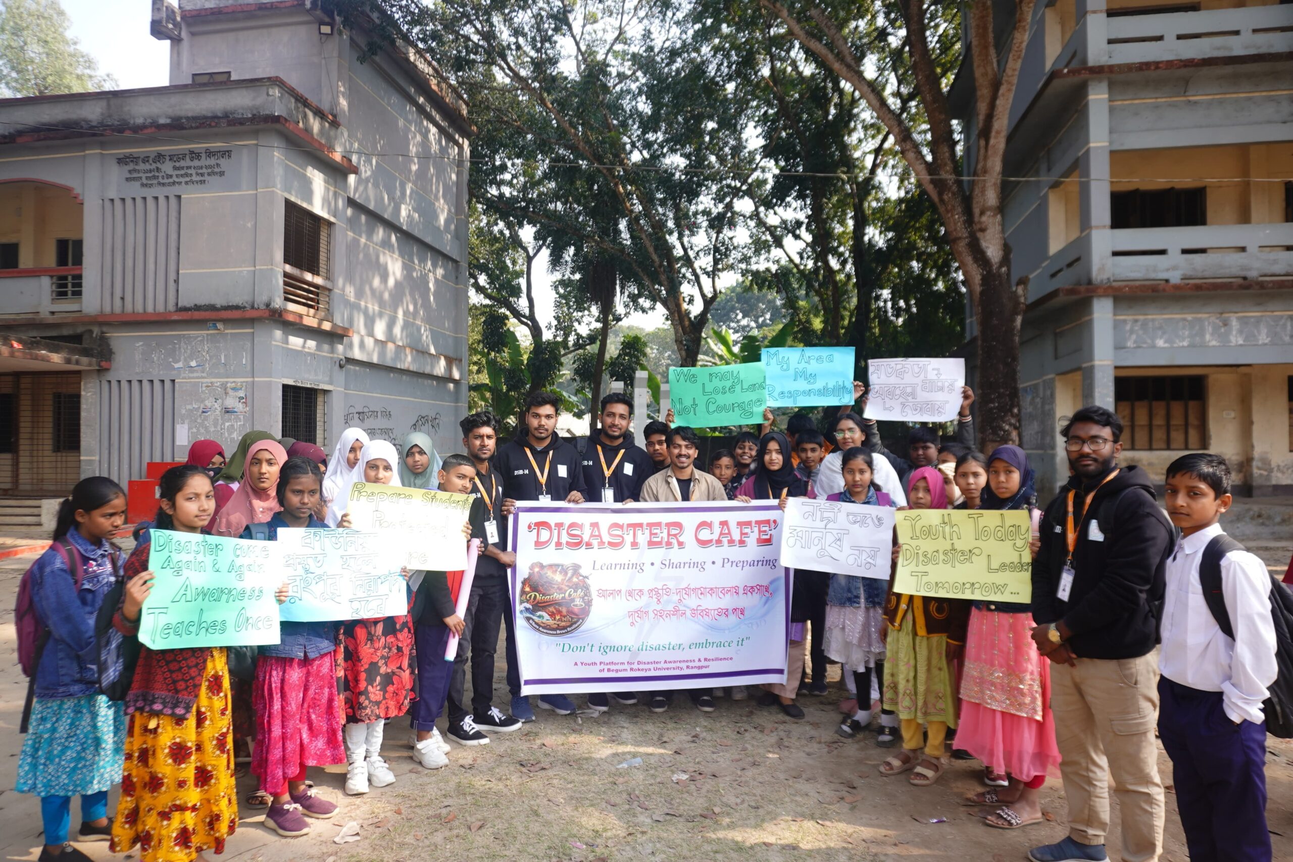 বেগম রোকেয়া বিশ্ববিদ্যালয়, রংপুর-এর দুর্যোগ বিজ্ঞান ও ব্যবস্থাপনা বিভাগের কয়েকজন শিক্ষার্থীর উদ্যোগে ‘ডিজাস্টার ক্যাফে’ গড়ে উঠেছে। সংগঠনটি মূলত তিন শ্রেণির মানুষদের নিয়ে কাজ করছে—শিক্ষার্থী, তরুণ এবং দুর্যোগ প্রবণ সম্প্রদায়। দুর্যোগের সময় কীভাবে নিরাপদ থাকা যায়, কীভাবে প্রস্তুতি নিতে হয় এবং সামাজিক সচেতনতামূলক কর্মকাণ্ডে সক্রিয় ভূমিকা রাখাই তাদের প্রধান লক্ষ্য।