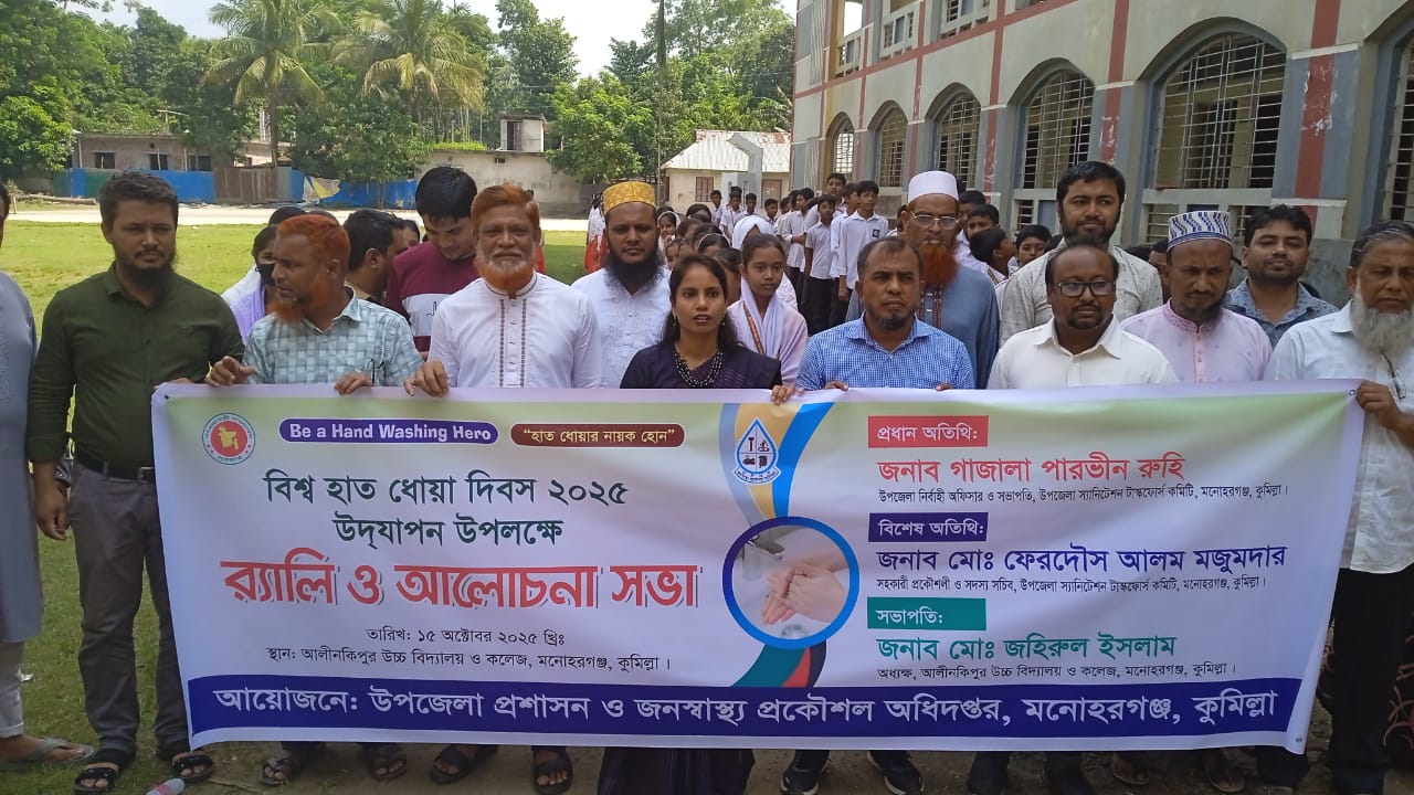 “হাত ধোয়ার নায়ক হোন” স্লোগানে কুমিল্লার মনোহরগঞ্জে আন্তর্জাতিক হাত ধোয়া দিবস উদযাপিত হয়েছে। উপজেলা জনস্বাস্থ্য প্রকৌশল অধিদপ্তরের উদ্যোগে বুধবার উপজেলার আলীনকিপুর স্কুল এন্ড কলেজ হলরুমে আলোচনা সভা অনুষ্ঠিত হয়। আলোচনা সভায় প্রধান অতিথি হিসেবে বক্তব্য রাখেন উপজেলা নির্বাহী অফিসার গাজালা পারভীন রুহি। আলীনকিপুর স্কুল এন্ড কলেজ অধ্যক্ষ মোঃ জহিরুল ইসলামের সভাপতিত্বে আরো বক্তব্য রাখেন উপজেলা জনস্বাস্থ্য প্রকৌশলী ফেরদৌস আলম, মনোহরগঞ্জ প্রেসক্লাবের সভাপতি মোঃ আবু ইউসুফ। আলোচনা সভায় আরো উপস্থিত ছিলেন উপজেলা প্রতিবন্ধী অফিসার রাশেদুল ইসলামসহ বিভিন্ন শ্রেণিপেশার মানুষসহ স্কুলের ছাত্রছাত্রীরা। আলোচনা সভার আগে একটি বর্ণাঢ্য র্যালি এবং কিভাবে হাত ধোয়ার মাধ্যমে হাতকে জীবাণু মুক্ত করা যায় সেই ৫টি ধাপ উপস্থিত সবাইকে শেখানো হয়। হাত ধোয়ার অনুষ্ঠান শেষে আলীনকিপুর সরকারি প্রাথমিক বিদ্যালয়ে টাইফয়েড টিকাদানের কার্যক্রক পরিদর্শন করেন উপজেলা নির্বাহী অফিসার গাজালা পারভীন রুহি।