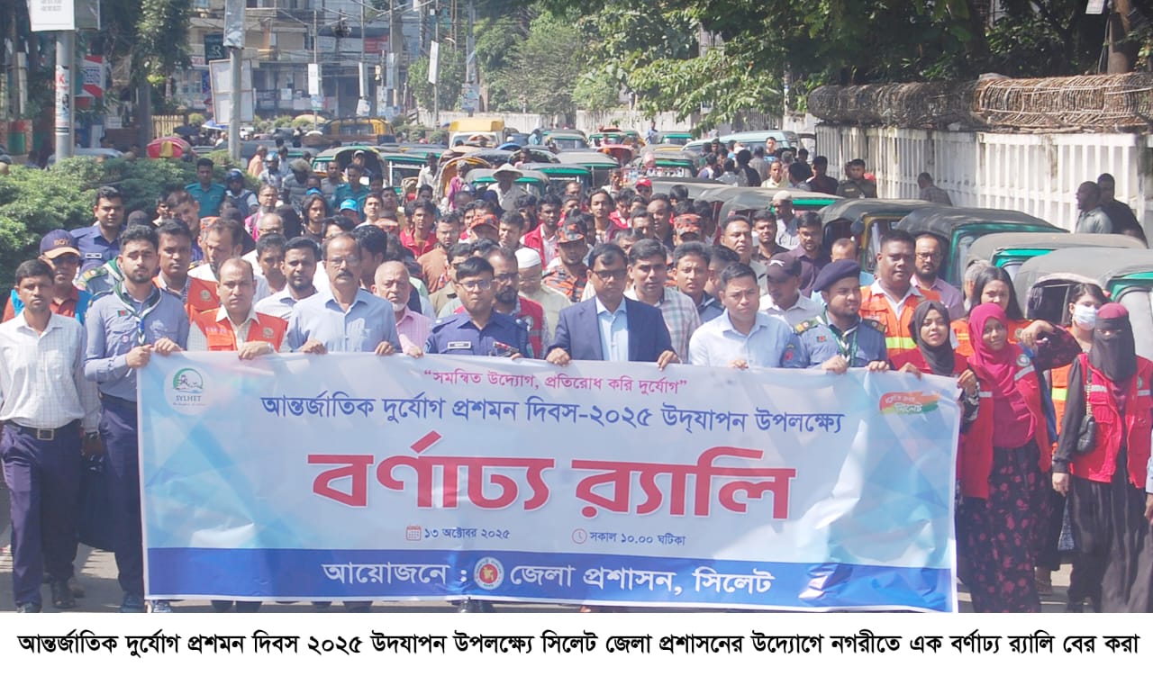 সোমবার (১৩ অক্টোবর) সকাল ১১টা জেলা প্রশাসকের সম্মেলন কক্ষে আন্তর্জাতিক দুর্যোগ প্রশমন দিবস ২০২৫ উদযাপন উপলক্ষ্যে জেলা প্রশাসন সিলেট আয়োজিত বর্ণাঢ্য র্যালি পরবর্তী আলোচনা সভায় প্রধান অতিথির বক্তব্যে তিনি উপরোক্ত কথাগুলো বলেন। র্যালিটি সিলেট জেলা প্রশাসক কার্যালয় থেকে শুরু হয়ে নগরীর বিভিন্ন সড়ক প্রদক্ষিণ শেষে জেলা প্রশাসক প্রাঙ্গণে এসে শেষ হয়।