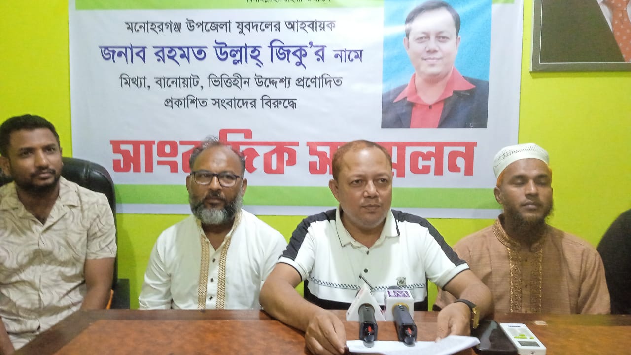 চাঁদা দাবির মিথ্যা মামলা এবং বিভিন্ন গণমাধ্যমে মিথ্যা মামলার উদ্বৃতি দিয়ে সংবাদ প্রকাশের প্রতিবাদে সংবাদ সম্মেলন করেছেন কুমিল্লার মনোহরগঞ্জ উপজেলা যুবদলের আহ্বায়ক রহমত উল্লাহ জিকু। শনিবার বিকেলে উপজেলা সদরে একটি হলরুমে অনুষ্ঠিত সংবাদ সম্মেলনে যুবদলের আহ্বায়ক রহমত উল্লাহ জিকু তার লিখিত বক্তব্যে বলেন- প্রিয় সাংবাদিক বন্ধুরা গত বৃহস্পতিবার দৈনিক আমার দেশসহ কয়েকটি অনলাইন পোর্টালে আমার বিরুদ্ধে একটি সংবাদ প্রকাশ করে যা আমার দৃষ্টি গোচর হয়। আমরা জানি সাংবাদিকরা হচ্ছেন জাতির বিবেক এবং আমার ভাষায় একজন নিরীক্ষক, সে নিরীক্ষকদের কাছে দেশের জনসাধারণ সুস্থ, সত্য সঠিক সংবাদ সবসময় আশা করে থাকে কিন্তু সঠিক তথ্য বিশ্লেষণ না করে কাউকে হেয় প্রতিপন্ন করার আশায় কোনো সংবাদ প্রচার করা মোটেই সমীচীন নয়। যে ব্যক্তিটি আমার বিরুদ্ধে চাঁদাবাজির মামলা করে তাকে ব্যক্তিগতভাবে কখনোই চিনতামনা কিন্তু বিগত কয়েকমাস আগে মামলার ১নং আসামি আবু বকর সিদ্দিক আলমগীর আমার চাচাতো ভাইয়ের শ্বশুর আমাকে ফোনে জানান, একজন ব্যক্তির সাথে ওনাদের জায়গা সংক্রান্ত বিরোধ চলে। বিষয়টি সমাধানের জন্য আমার সহযোগিতা কামনা করেন।