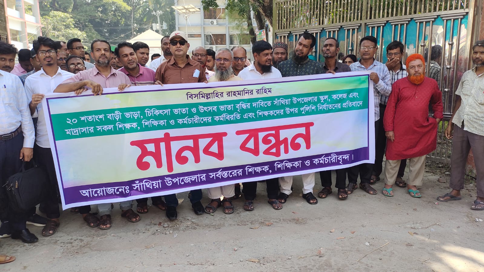 মঙ্গলবার দুপুর ১২ ঘটিকার সময় সাঁথিয়া উপজেলা গেটের সামনে সাঁথিয়ার বিভিন্ন স্কুল এবং কলেজের শিক্ষকরা মানব বন্ধনে অংশগ্রহণ করেন। জোড়গাছা ডিগ্রী কলেজের সহকারী অধ্যাপক আব্দুল হাই এর সভাপতিতত্বে এবং দাড়ামুদা স্কুল এন্ড কলেজের শিক্ষক নাছির উদ্দিন এর পরিচালনায় উক্ত মানব বন্ধনে বক্তব্য রাখেন সাথিয়া মহিলা ডিগ্রী কলেজের সহকারী অধ্যাপক মনসুর আলী, জোড়গাছা কলেজের সহকারী অধ্যাপক আনোয়ার হোসেন উল্লাস, সাঁথিয়া পাইলট বালিকা উচ্চ বিদ্যালয়ের প্রধান শিক্ষক আজিবুর রহমান, সহকারী অধ্যাপক আশরাফ আলী, দৌলতপুর ইমাম হোসাইন একাডেমির শিক্ষকআনসার আলী, দাড়ামুদা স্কুল এন্ড কলেজের শিক্ষক ইউনুস আলী প্রমুখ। শিক্ষকরা তাদের বক্তব্যে বলেন, ৫০০ টাকা বাড়ি ভাড়া ভাতার প্রজ্ঞাপন বাতিল করে অনতিবিলম্বে ২০ শতাংশ হারে বাড়ি ভাড়া ভাতা, ১৫০০ টাকা চিকিৎসা ভাতা এবং মূল বেতনের ৭৫ শতাংশ হারে উৎসব বোনাস প্রদানের আহ্বান জানান। কেন্দ্রীয় ঘোষিত শিক্ষকদের দাবি আদায়ের যে কোনো কর্মসূচি সাঁথিয়ার শিক্ষকরা পালন করবে।