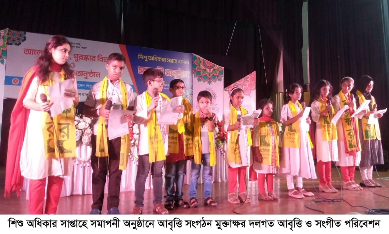 শিশুদের চোখ দিয়ে বড়রা যখন বিশ্বকে দেখবে পৃথিবীটা হবে ফুলেল বাগান। গত ৬ অক্টোবর থেকে শুরু করে ১৪ অক্টোবর ৯ দিন ব্যাপী শিশুদের নিয়ে আলোচনা ও সাংস্কৃতিক অনুষ্ঠানের আয়োজন করে সিলেট জেলা প্রশাসন ও শিশু একাডেমি সিলেট। সমাপনী দিনে ১৪ অক্টোবর মঙ্গলবার বিকেল সারে চারটায় প্রথম দিকে সাংস্কৃতিক অনুষ্ঠানে শুরুতেই আবৃত্তি সংগঠন মুক্তাক্ষর দলগত আবৃত্তি ও সংগীত পরিবেশন করে।