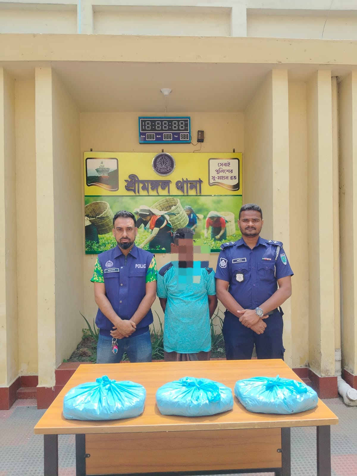 মৌলভীবাজার জেলার শ্রীমঙ্গল থানা পুলিশের অভিযানে সাব ইন্সপেক্টর মোঃ আনিছুর রহমান ও এএসআই আবু তালেব এর নেতৃত্বে পুলিশের একটি অভিযানিক টিম গোপন সংবাদের ভিত্তিতে ইং ০৭/০৪/২০২৬ তারিখ রাত ০৩.৩০ ঘটিকায় শ্রীমঙ্গল ধানাধীন ৬ নং আশিদ্রোন ইউনিয়নের সুনগইড় প্রাইমারী স্কুলের সামনে মাদক দ্রব্য গাঁজা বিক্রয়ের উদ্দেশ্য পরিবহন কালে মাদক কারবারি মোঃ ফরিদুজ্জামান মাসুদ (৪২), পিতাঃ মৃত আসকিন মিয়া, মাতাঃ গোলজাহান বেগম, সাং সুনগইড় , ৬নং আশিদ্রোন ইউপি, থানাঃ শ্রীমঙ্গল, জেলা: মৌলভীবাজারকে আটক করা হয়। তল্লাশি করে তার নিকট হতে ০৩ (তিন) কেজি গাঁজা উদ্ধার করা হয়, যার মূ্ল্য অনুমান ৯০,০০০ টাকা।