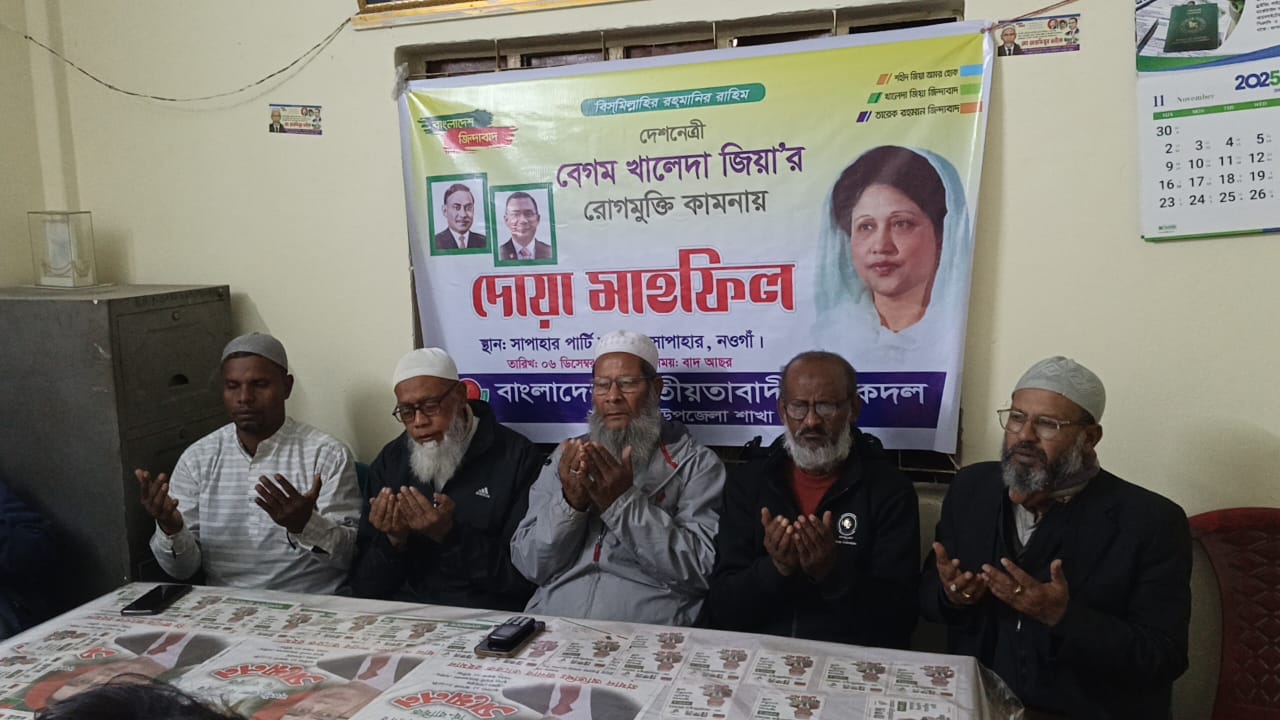 নওগাঁর সাপাহারে সাবেক প্রধানমন্ত্রী ও বিএনপি চেয়ারপার্সন বেগম খালেদা জিয়ার রোগ মুক্তি কামনায় দোয়া মাহফিল অনুষ্ঠিত হয়েছে।