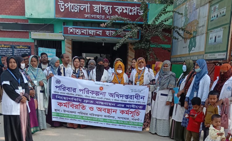 পরিবার পরিকল্পনা অধিদপ্তরাধীন পরিবার কল্যাণ পরিদর্শিকা (FWV), পরিবার কল্যাণ সহকারী (FWA) ও পরিবার পরিকল্পনা পরিদর্শক (FPI) পদের নিয়োগবিধি দ্রুত বাস্তবায়নসহ বিভিন্ন দাবিতে নওগাঁর সাপাহারে কর্মবিরতি ও অবস্থান কর্মসূচি পালন করেছ মাঠপর্যায়ের কর্মীরা।