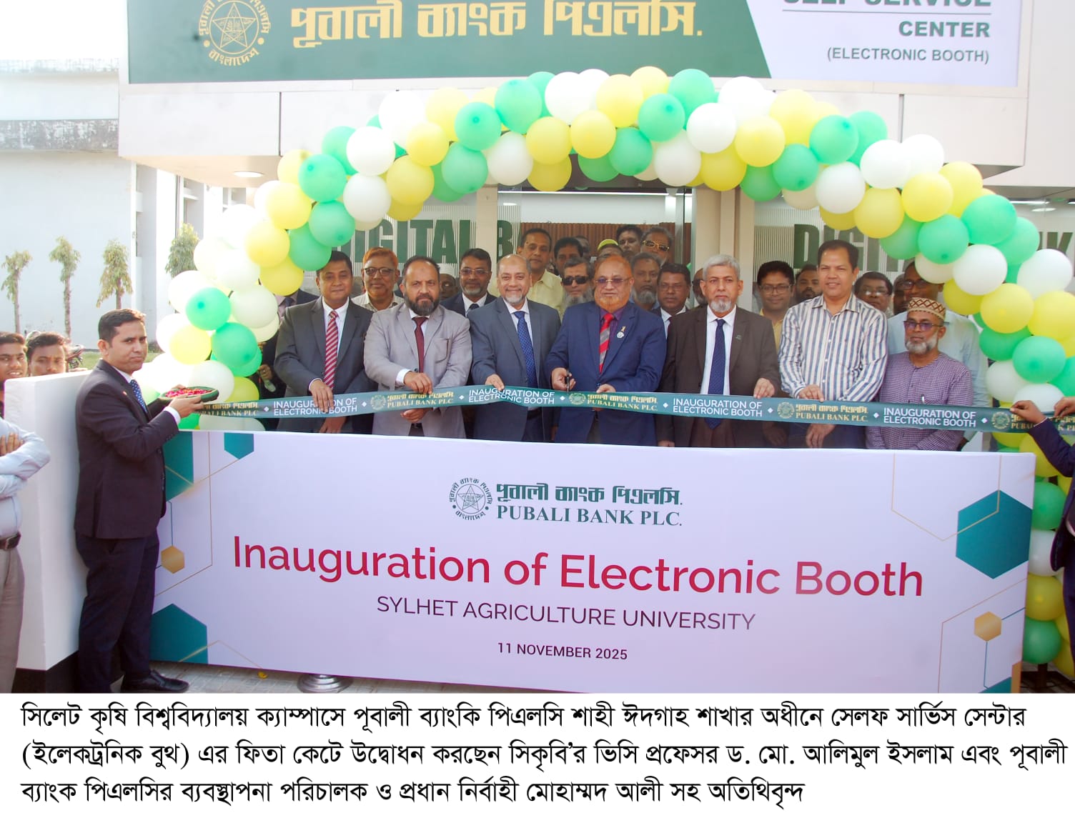 সিলেটে প্রথমবারের মতো সেলফ সার্ভিস সেন্টার (ইলেকট্রনিক বুথ) চালু করেছে পূবালী ব্যাংক পিএলসি। মঙ্গলবার (১১ নভেম্বর) সিলেট কৃষি বিশ্ববিদ্যালয় ( সিকৃবি) ক্যাম্পাসে পূবালী ব্যাংক পিএলসি শাহী ঈদগাহ শাখার অধীনে এই ইলেকট্রনিক বুথের আনুষ্ঠানিকভাবে ফিতা কেটে উদ্বোধন করা হয়।