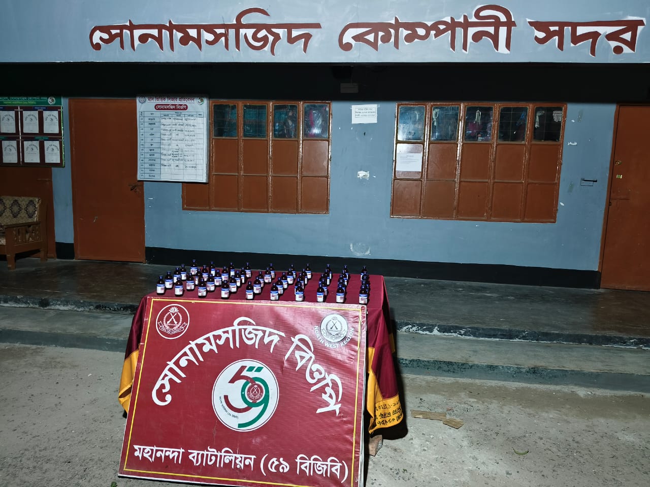 চাঁপাইনবাবগঞ্জ মহানন্দা ব্যাটালিয়ান (৫৯ বিজিবি) দেশের তরুন প্রজন্ম এবং যুবসমাজকে মাদকের ভয়াবহতা ও করাল গ্রাস হতে রক্ষায় বিজিবি সদস্যরা সীমান্তে সর্বদা সচেষ্ট অবস্থায় দায়িত্ব পালন করছে। এরই ধারাবাহিকতায় গতকাল (১৯ নভেম্বর) রাত্রী আনুমানিক ৯:৪০ ঘটিকায় মহানন্দা ব্যাটালিয়ন (৫৯ বিজিবি) এর সোনামসজিদ বিওপি’র একটি বিশেষ টহল দল সীমান্ত পিলার ১৮৫- হতে আনুমানিক ৪০০ গজ বাংলাদেশের অভ্যন্তরে চাঁপাইনবাবগঞ্জ জেলার শিবগঞ্জ থানাধীন শাহাবাজপুর ইউনিয়নের তোয়াখানা আলিম মাদ্রাসা হতে ১০০ গজ পশ্চিমে আম বাগানের মধ্যে অভিযান পরিচালনা করে। উক্ত অভিযানে টহল দল মালিকবিহীন ৫০ বোতল ভারতীয় স্কাপ সিরাপ (যাহা ফেন্সিডিল এর নায় কাজ করে) আটক করতে সক্ষম হয়। অভিযান পরিচালনার সময় চোরাকারবারীরা বিজিবি’র উপস্থিতি টের পেয়ে ঘটনাস্থল হতে পালিয়ে যায়। বর্তমানে আটককৃত ভারতীয় স্কাপ সিরাপ গুলো জিডি করতঃ শিবগঞ্জ থানায় হস্তান্তরের কার্যক্রম চলমান রয়েছে।
