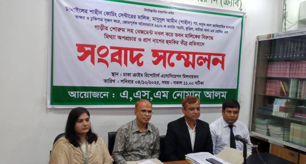 টাঙ্গাইলের শাহীন কোচিং সেন্টারের মালিক মোঃ মাছুদুল আমীন (শাহীন) গং কর্তৃক জাল জালিয়াতির মাধ্যমে স্বাক্ষর ও চুক্তিপত্র সৃজন করে জোরপূর্বক অবৈধভাবে ৯৬/৩-ক, প্রগতী স্মরণী, কুড়িল, ভাটারা থানার হোল্ডিংয়ের গাড়ীর শো-রুম (নীচ তলা) সহ Basement দখল করে ভবন মালিকের বিরুদ্ধে মিথ্যা অপপ্রচার ও প্রাণ নাশের হুমকির তীব্র প্রতিবাদে সংবাদ সম্মেলন ।